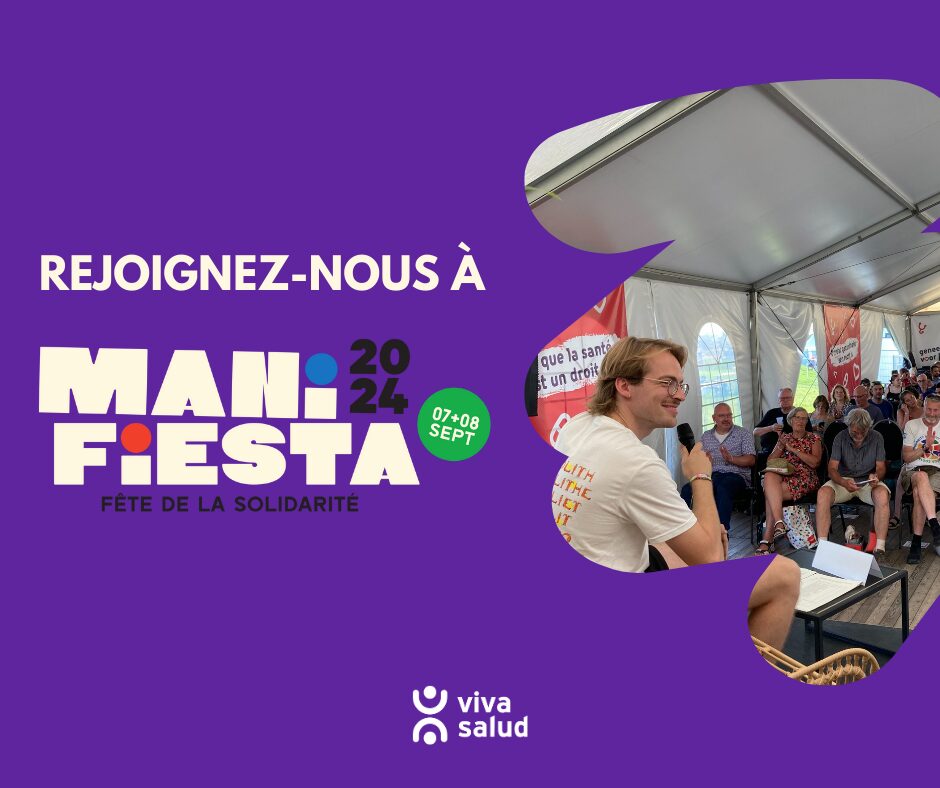 Viva Salud renouvelle sa présence au festival ManiFiesta ! Les 7 et 8 septembre, nous tiendrons un stand pour faire connaître nos campagnes et activités et y proposerons des jeux ludiques ! Comme chaque année, chaque gobelet récolté contribuera contribuera à soutenir le travail de nos partenaires en Palestine, aux Philippines et en RD Congo. Nous serons également présents dans la tente Intal pour parler du système de santé en Palestine et au Carré Santé pour sensibiliser à la crise mondiale des systèmes de santé.