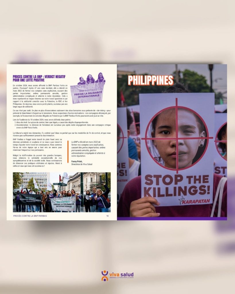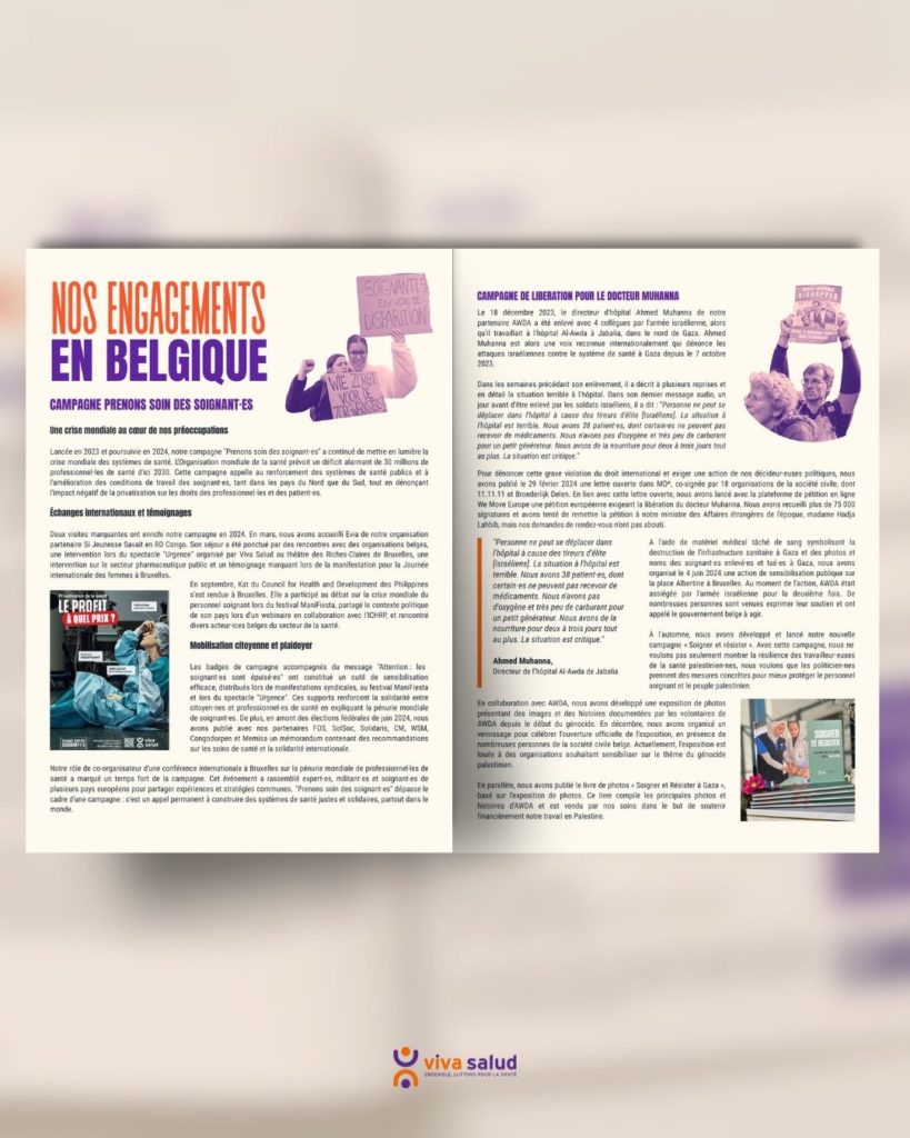 Viva Salud has been actively involved in the global movement to end the genocide in Palestine, with a particular focus on the situation of healthcare workers, such as Dr Muhanna, who was abducted by the Israeli army. We have also continued our «Let's take care of healthcare workers» campaign to highlight the precarious situation of healthcare workers around the world.