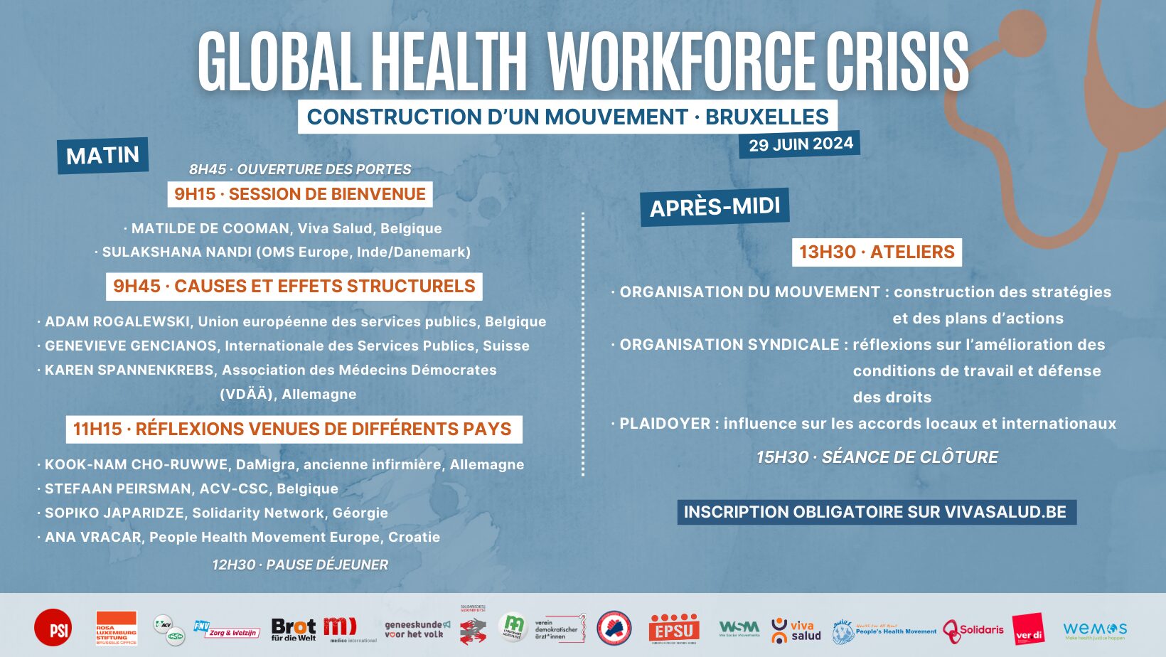 Un événement organisé par : Viva Salud, PHM Europe, Solidarity Network, Wemos, Medico International, Verein demokratischer Ärztinnen*, Brot für die Welt, We Social Movements, Solidarisches Gesundheitswesen, CM, GVHV, FNV, Solidaris, ACV-CSC, EPSU, Ver.di, Rosa Luxemburg Stiftung, Public Services International.